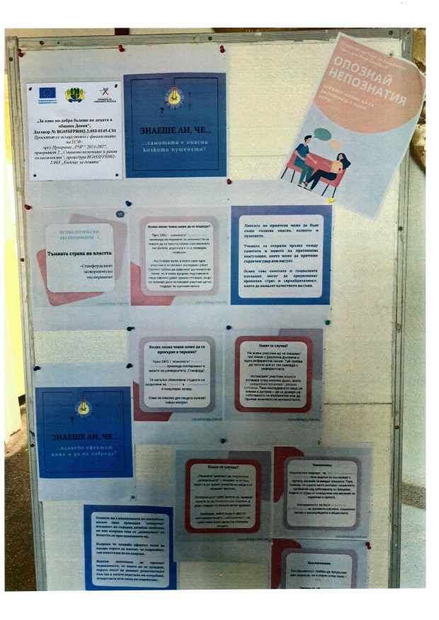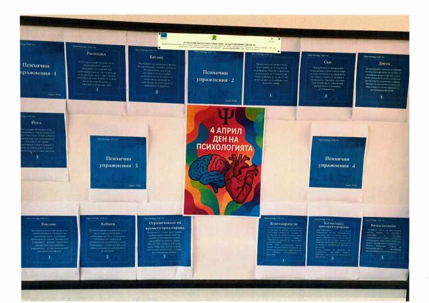 - По случай 4-ти април – Деня на психологията специалисти по проекта организираха седмица пълна психологияв сградата на СУ „В.Левски“, гр.Девня. Бяха създадени информационни табла с интересни факти; проведе се Психологическа лаборатория – изследване на себе си чрез изкуство и изследване на себе си чрез музика; и психологическа игра „Опознай непознатия“.